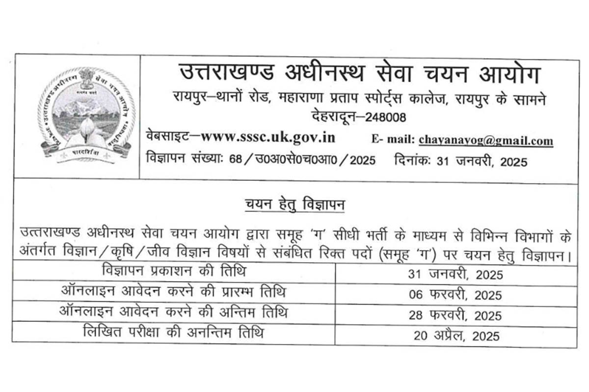Uttarakhand Subordinate Services Selection Commission (UKSSSC) is recruiting 241 Group ‘C’ posts in various departments. These posts include Assistant Agriculture Officer, Technical Assistant and Laboratory Assistant. The application process for these posts will start from today. Interested and eligible candidates can apply by visiting the official website.