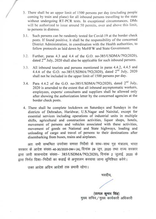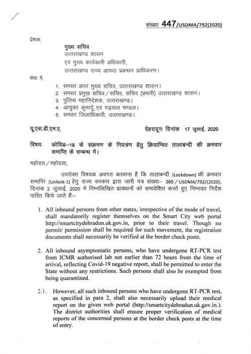 - All inbound persons from other states, irrespective of mode of travel, shall mandatorily register themselves on the Smart City Web Portal http://smartcitydehradun.uk.gov.in, prior to their travel. Though no permit/permision shall be required for such movement, the registration documents shall necessarily be verified at the border check post.